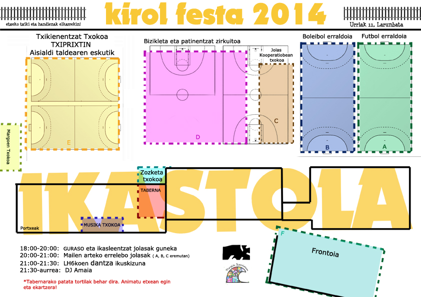 Aurreko urtean bezala, aurten ere, Kirol Festa antolatu dugu larunbaterako. Guraso eta ikasleak elkarrekin jolasteko eta ikastolako familia osoa elkarrekin ongi pasatzeko asmoz, Arratsaldeko 18etatik Aurrera, jolas ezberdinak izango dira guneetan banatuta, musika, margoen txokoa, zozketak, LH-ko ikasleek prestatutako dantza ikuskizuna, Dj-arekin dantzaldian, afarimerienda,…