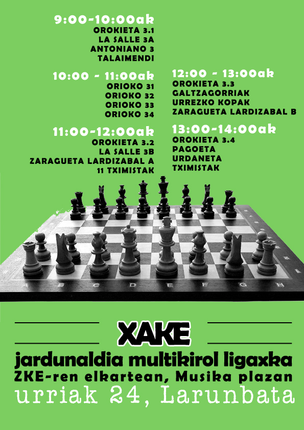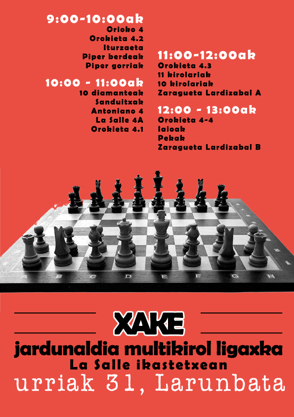 Bestalde gogoratu datorren astean ekingo diogun taldekiroletan parte hartu ahal izateko 2 guraso arduradun derrigorrezkoak direla talde bakoitzeko. Mesedez, errepasatu zuen taldeak iada baduen arduradunik edo ez. Guraso arduradinik ez duen taldeak ezingo duelako parte hartu txapelketan.